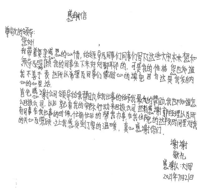 经过半个月治疗休养,刘军手部已无大碍。出院后的他写了一封感谢信并为公司送了一面锦旗,他说道,是云开体育网页版登录入口-云开(中国)这个大家庭让他感受到了关怀和温暖,他表示要把这种关怀变成工作上的动力,争取早日返回工作岗位,努力工作,回报大家的关心和关爱。